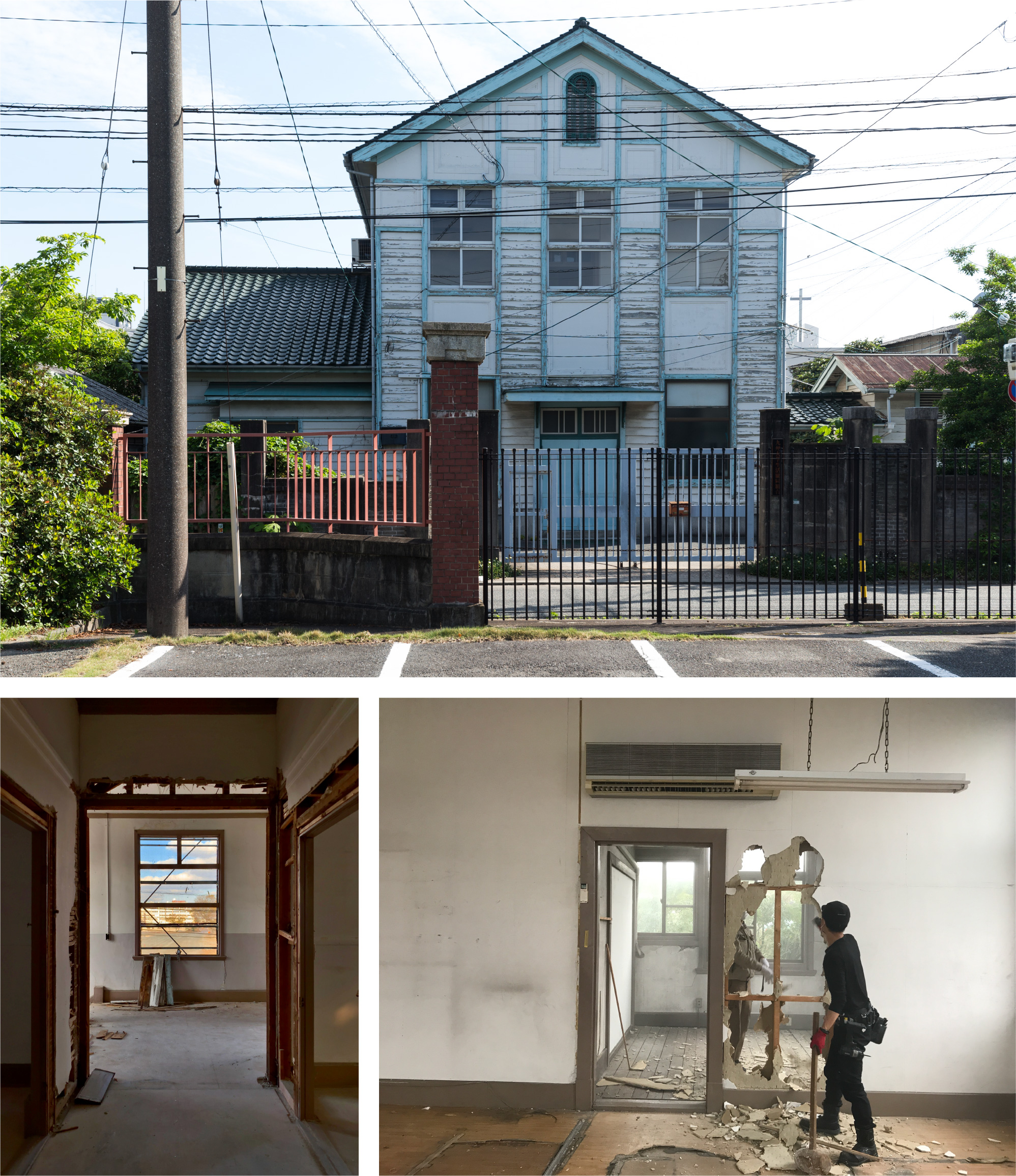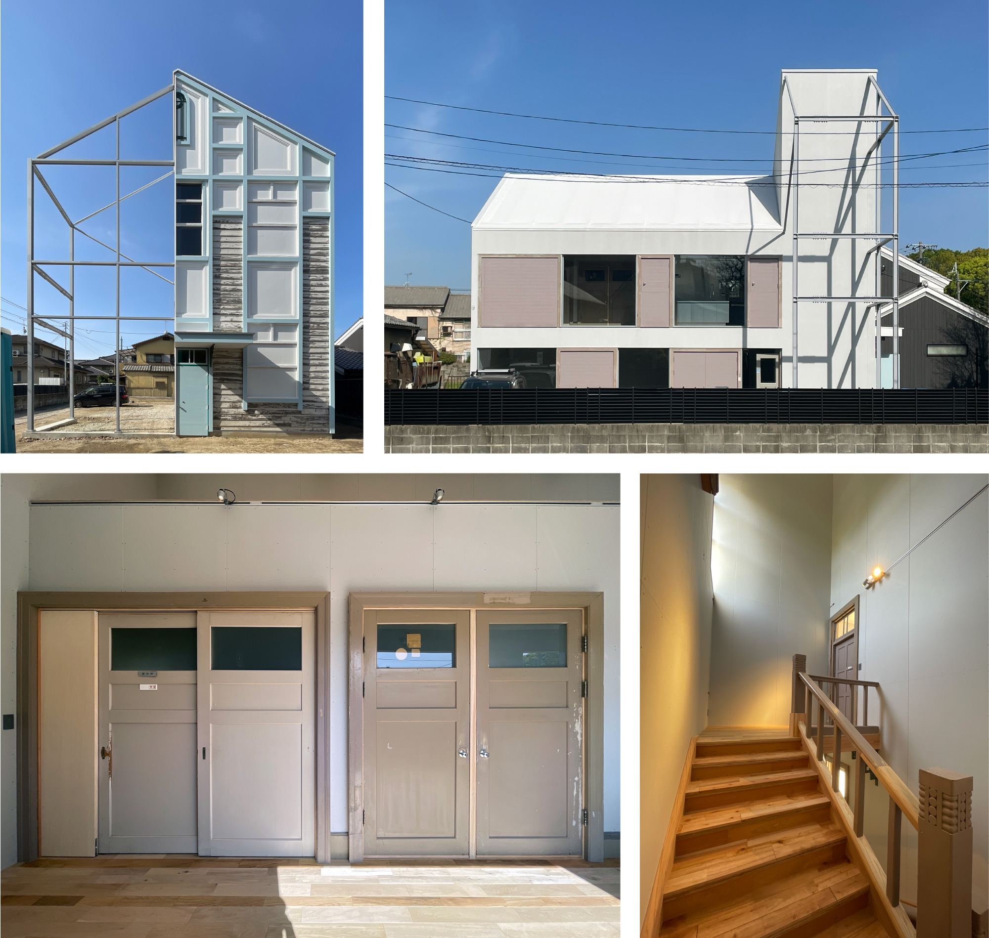 福岡・筥崎宮参道に面して建ち、1Fをオフィス、2Fを住空間とした職住一体の建物。1928年竣工の洋館建築・九州大学松浜厚生施設の歴史的要素を引き継ぐ。いわゆる文化財保存のように厳密な修理を行うのではなく、歴史的要素(historical elements)の再配置によって選択的移築を行い、その要素のもつ歴史的価値や元のコンテクストを新たな建築とつなぎ合わせた。歴史的建造物のファサードによる〈都市的記憶〉その〈実〉としての歴史的建造物のボリュームを再解釈した〈虚〉としての鉄骨フレームによってマッスとヴォイドの対比的な構成としている。建具と空間構成の再解釈による〈空間的記憶〉古い建具配置と気積のボリュームによる階段室や廊下空間を継承している。今後、〈虚〉として生まれたオープンスペースを活用し、地域に開かれた場、実装・実験の場として、街と新たに接続させる。
